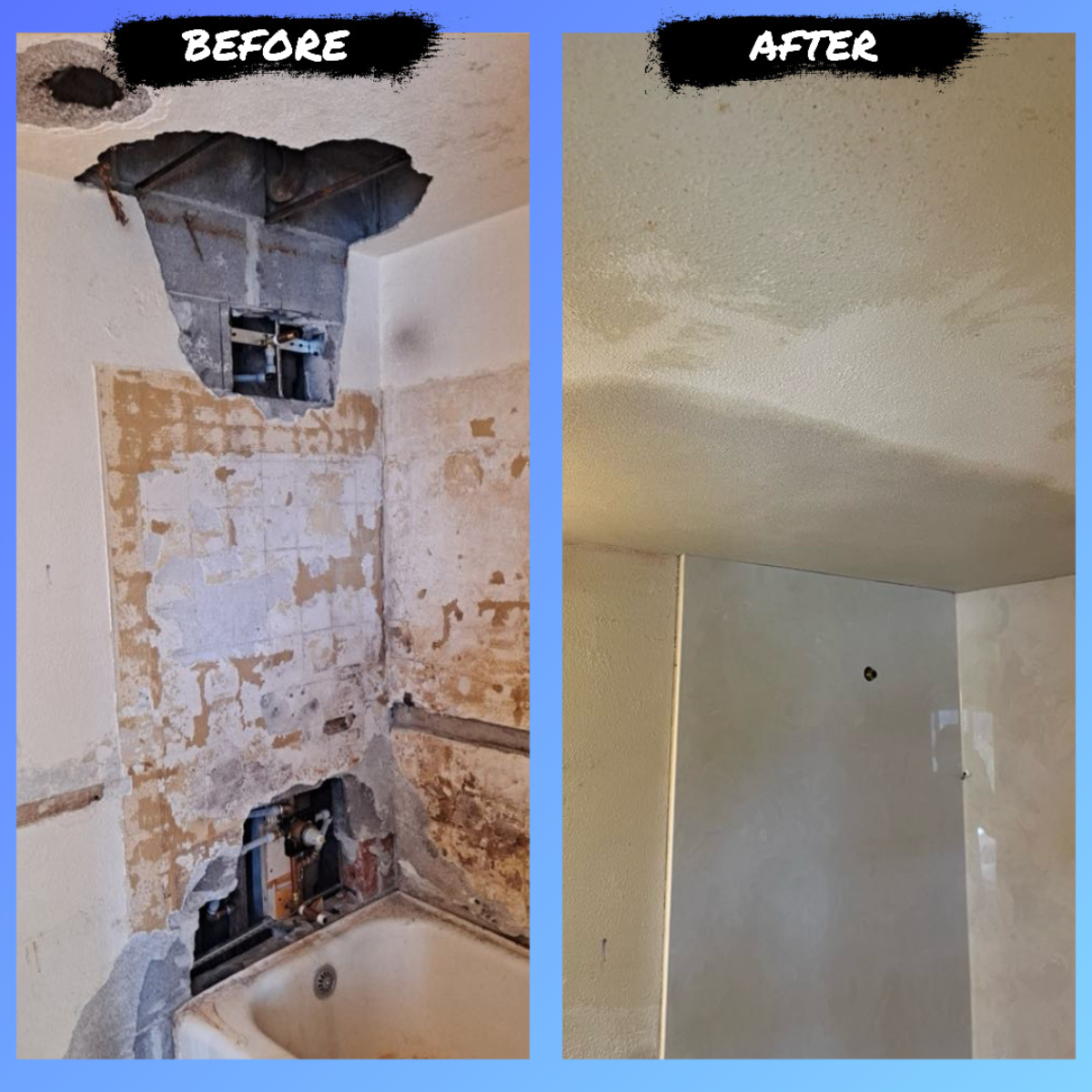 Before and after drywall patch in shower